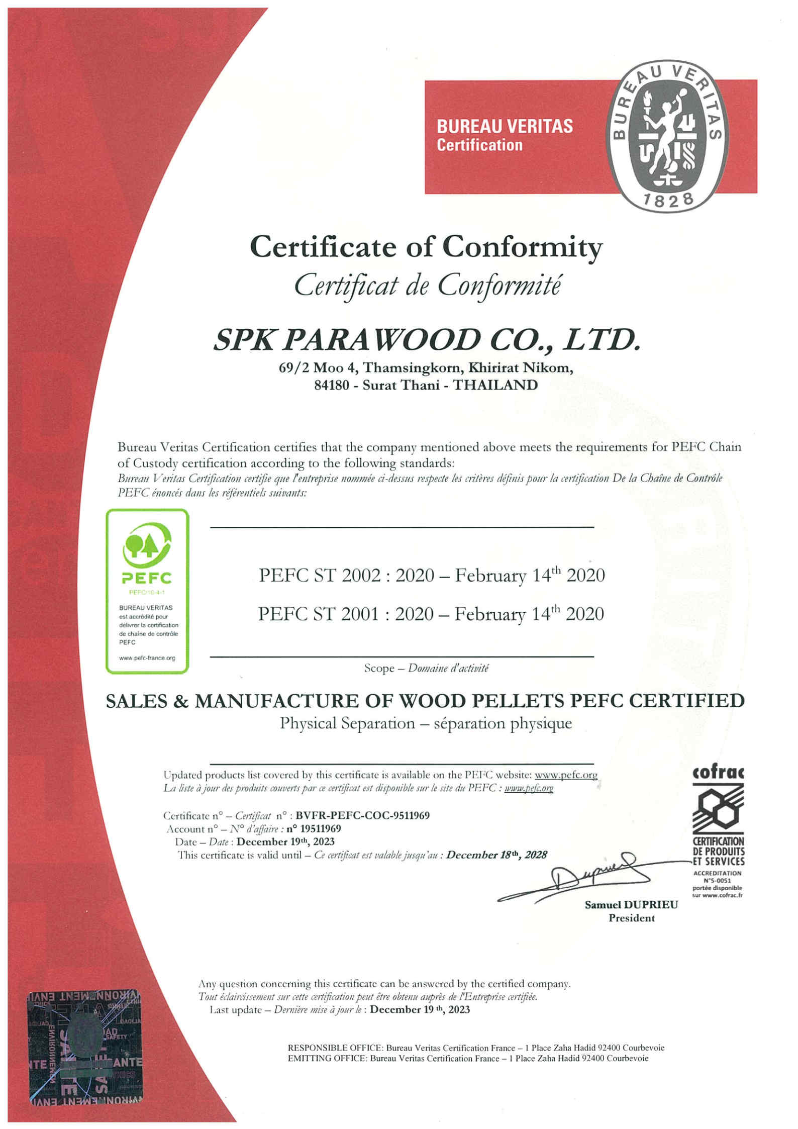 SPK Parawood Co., Ltd. is certified under the PEFC™ Chain of Custody (CoC) system, enabling us to supply biomass products made from PEFC-certified and PEFC Controlled Sources (CS) raw materials.