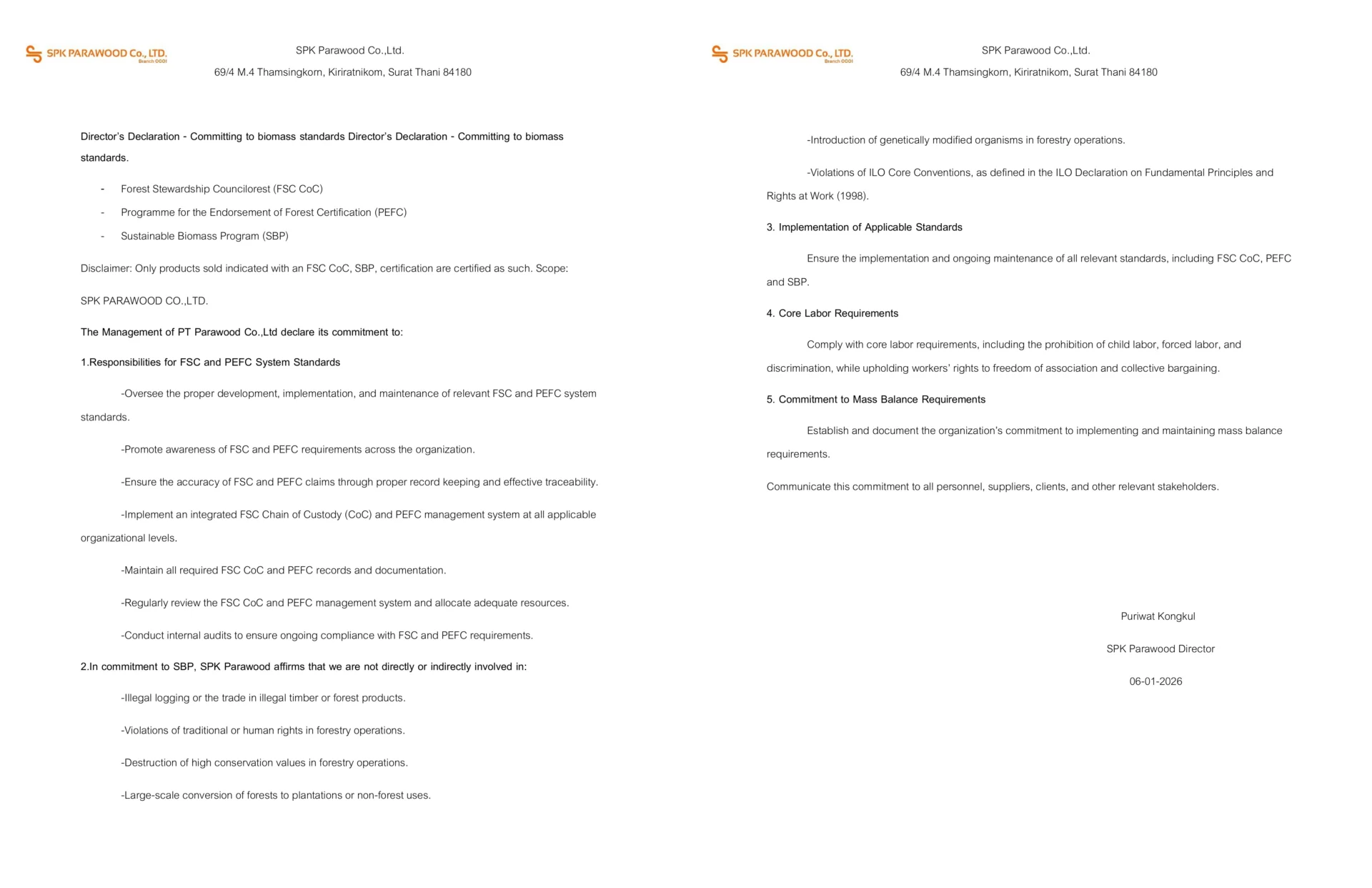 Board of Directors’ Declaration on Commitment to Compliance with Biomass Sustainability Standards